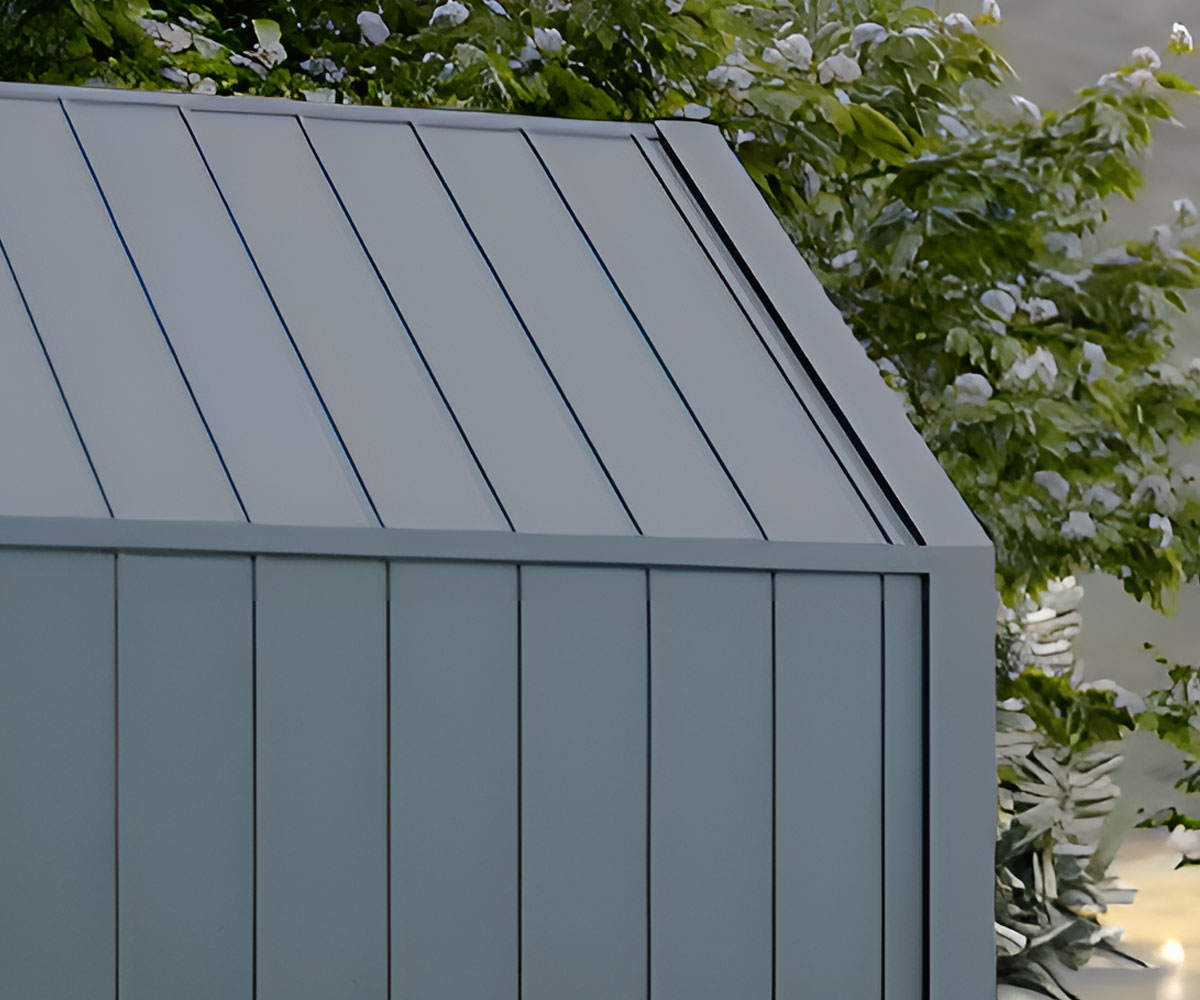 Il rivestimento delle pareti perimetrali esterne e del tetto è realizzato tramite l’applicazione di pannelli prefiniti in alluminio di alta qualità, che si distinguono per durata del materiale resistente sia alla ruggine che alla rottura. Il prodotto è esente da manutenzione.