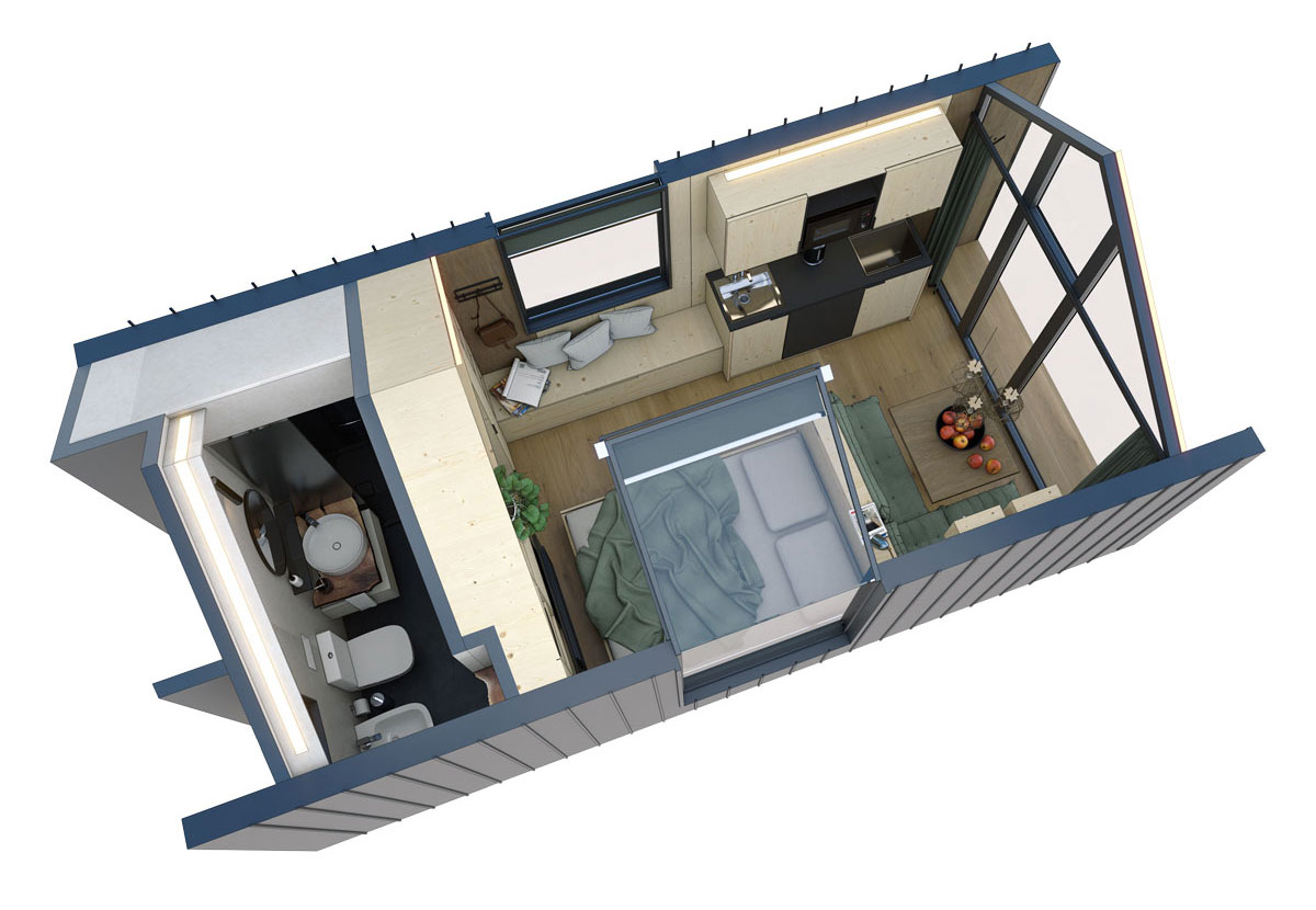 Nella versione Lodge una cucina completa di lavello con miscelatore, piano cottura a induzione, frigorifero sotto top.